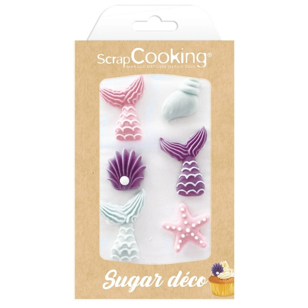 6 Mermaid-themed sweet scenery decorations Ingredients: sugar, thickening agent E414, soluble MILK protein, acidifier E330, safflower concentrate, spirulina concentrate, colouring: E120.