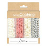 Les 4 variétés de décors sucrés sont emballées dans une boite transparente et conditionnées dans des tubes individuels refermables. Se conservent au sec pour être réutilisé pour toute nouvelle occasion. Poids net total : 56g.