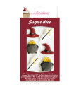 Ce kit de Décosucres inclut 2 chaudrons (l.4,5 x H.4 cm), 2 baguettes magiques (l.5,5 x H.2,5 cm), 2 chapeaux de sorcier (l.4 x H.3 cm).