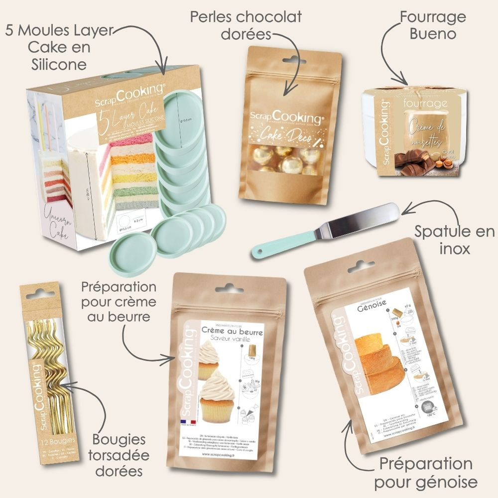 Réalisez facilement un layer cake maison généreux avec ce pack ScrapCooking®. En un seul clic, l’ensemble des produits sont ajoutés à votre panier pour vous lancer immédiatement dans la recette et créer un gâteau d’anniversaire à étages parfaitement équilibré. Ce pack a été pensé pour vous guider de la première génoise jusqu’à la touche finale de décoration.