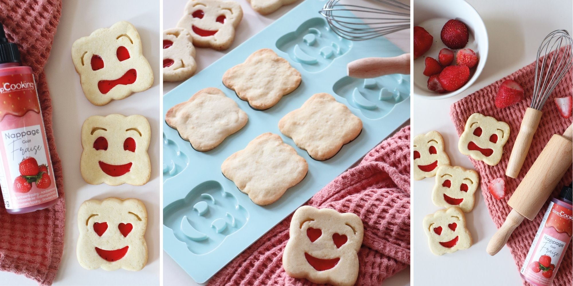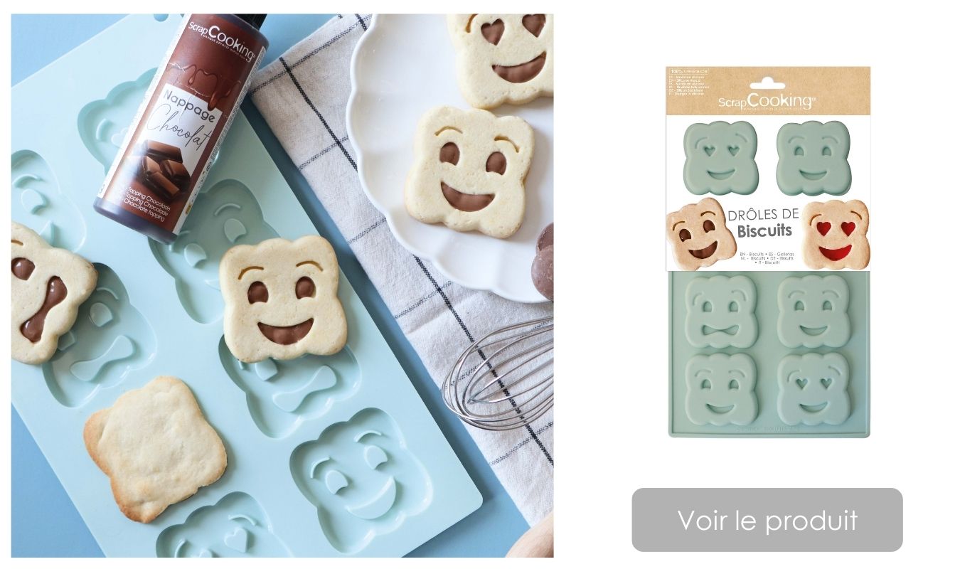 Une fois les biscuits complètement refroidis, remplissez les cavités des yeux et de la bouche avec du chocolat fondu, du nappage fraise ou chocolat ScrapCooking®.