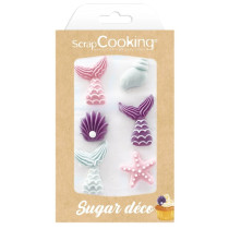 Utilisez de la pâte à sucre pour réaliser les décoration. Nous avons utilisé notre lot de 5 pâte à sucre sirène ! Pour les décorations, vous devrez préparer : la queue de la sirène, un petit boudin qui servira de ceinture, le haut du maillot de bain et des rochers. Collez ensuite les éléments avec de la colle alimentaire et ajoutez un peu de colorant de surface avec un pinceau pour faire scintiller la sirène !