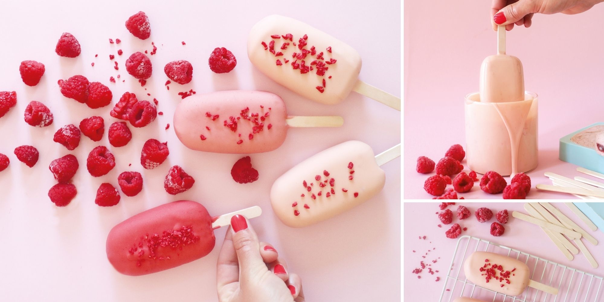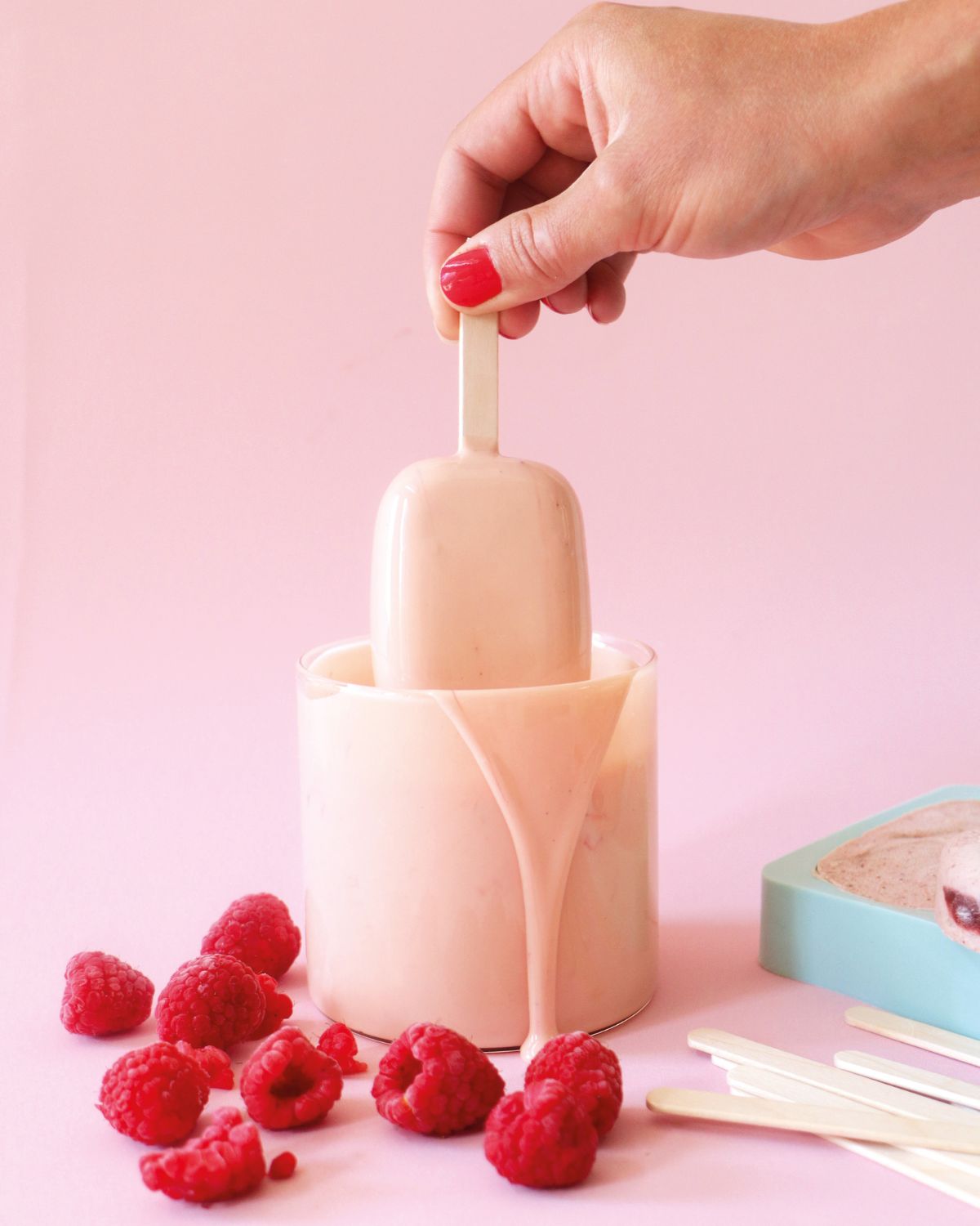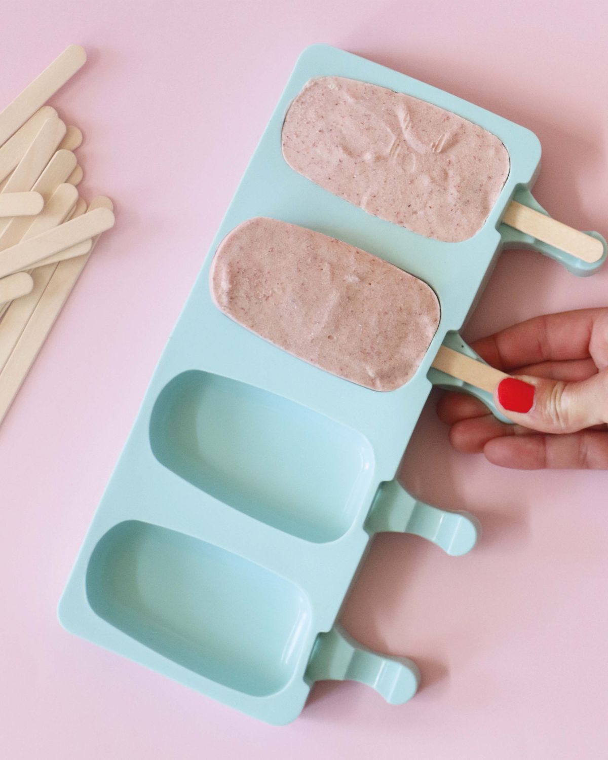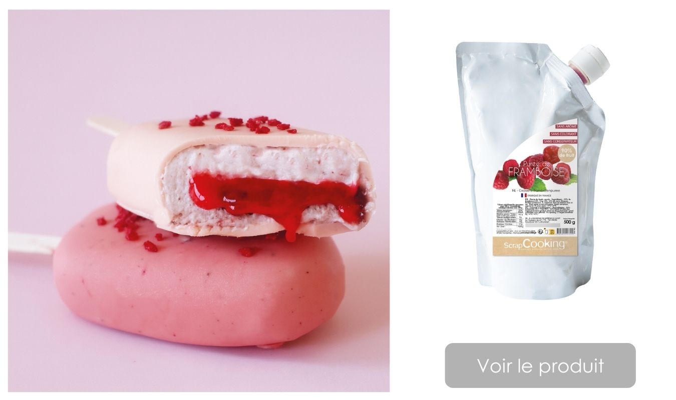 Versez la moitié de la préparation dans votre moule à bâtonnets glacés ScrapCooking®, ajoutez un peu de purée de framboises puis le reste de glace framboise.