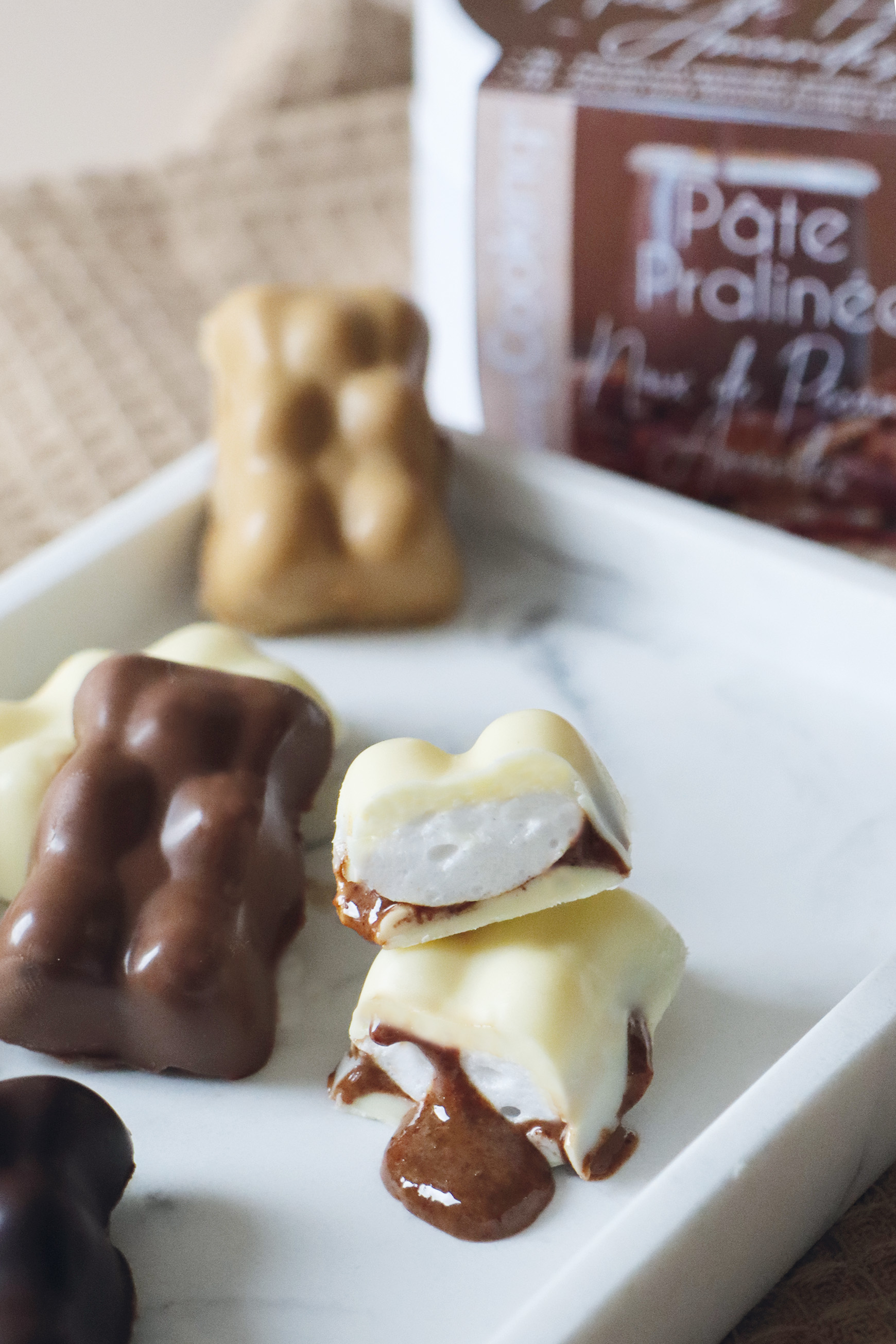 Remplissez les moules aux 2/3 avec la guimauve et laissez prendre 10 à 15 minutes au réfrigérateur. Une fois la guimauve légèrement figée, ajoutez une touche de pâte de praliné pécan. Terminez en recouvrant le tout de chocolat fondu.